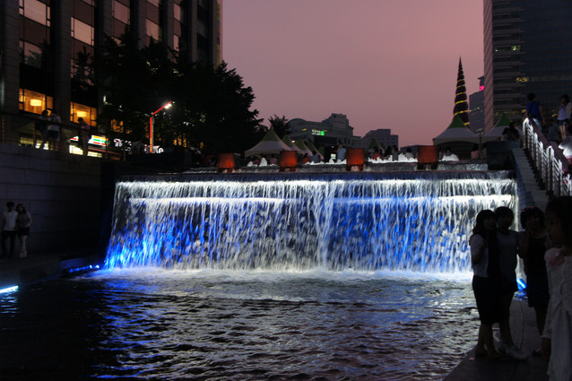 來到清溪川的源頭,光化門站附近,打燈之後的清溪川人造瀑布真的好漂亮哦